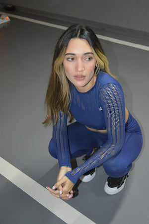 Crop top manga larga corto con tecnología Seamless, top soporte medio. Modelo usando talla Xs-S.