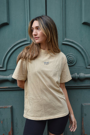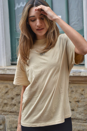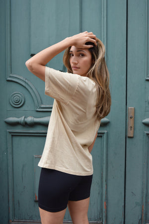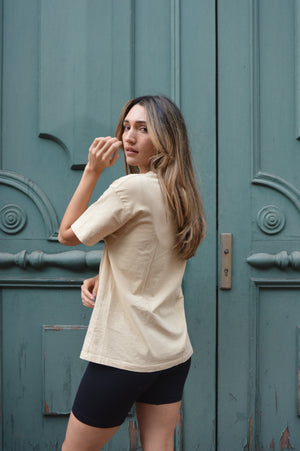 Camiseta 100% algodón, horma oversized. Modelo usando talla Xs-S.