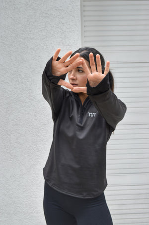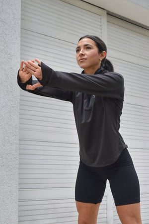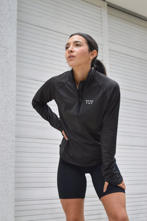 Chaqueta con tecnología Dry-fit cuello tortuga con protección solar y antibacterial. Modelo usando talla Xs-S.