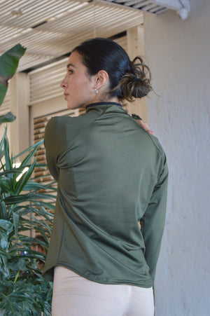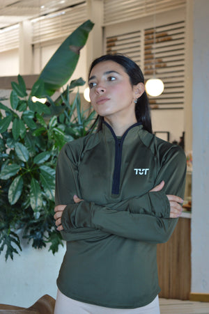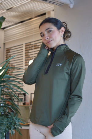 Chaqueta con tecnología Dry-fit cuello tortuga con protección solar y antibacterial. Modelo usando Xs-S.